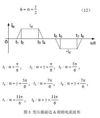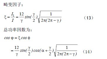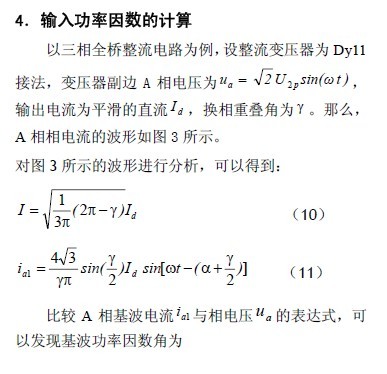 雖然公式(12)、(13)、(14)是從變壓器副邊的電流波形推導(dǎo)出來的,但如果不考慮變壓器的空載電流,變壓器本身并不會(huì)改變整流器的功率因數(shù)。所以,從變壓器的原邊來看,這三個(gè)公式依然正確。