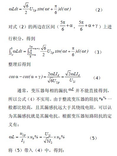 通過詳細(xì)的理論分析,推導(dǎo)出了整流變壓器的阻抗與換相重疊角、輸出電壓、輸入功率因數(shù)的關(guān)系。這些公式具有普適性。較之公式(4),公式(6)具有更大的實(shí)用價(jià)值。這些公式對(duì)三相整流電路的設(shè)計(jì)具有較強(qiáng)的指導(dǎo)意義。